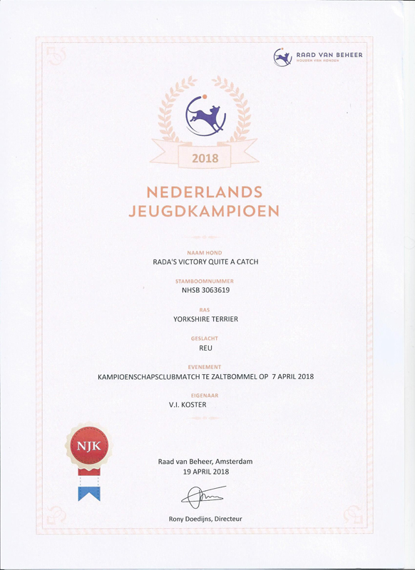 After obtaining the last neccessary JCAC qualification on the Championship clubmatch in Zaltbommel from April 7, 2018 is RADA'S VICTORY QUITE A CATCH now: Junior Champion of the Netherlands